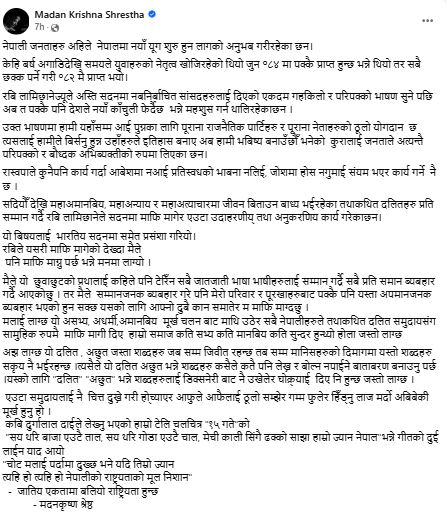 दलित समुदायसँग मदनकृष्णको माफी: ‘मेरा पुर्खाबाट भएका गल्तीप्रति क्षमा चाहन्छु’